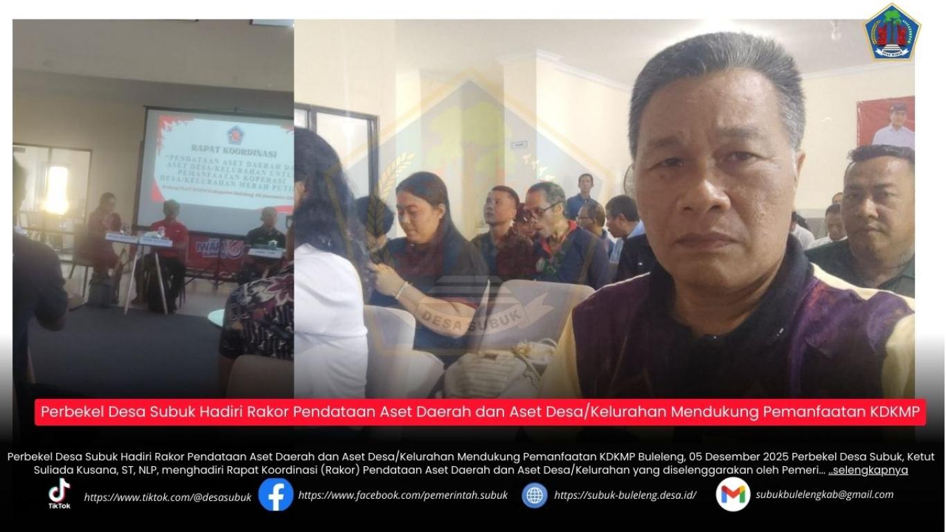 Perbekel Desa Subuk, Ketut Suliada Kusana, ST, NLP, menghadiri Rapat Koordinasi (Rakor) Pendataan Aset Daerah dan Aset Desa/Kelurahan yang diselenggarakan oleh Pemerintah Kabupaten Buleleng pada Jumat, 05 Desember 2025, bertempat di Gedung PLUT KUMKM Kabupaten Buleleng. Kegiatan ini merupakan tindak lanjut dari kebijakan pemerintah pusat terkait percepatan pembentukan dan pengembangan Koperasi Desa/Kelurahan Merah Putih (KDKMP).