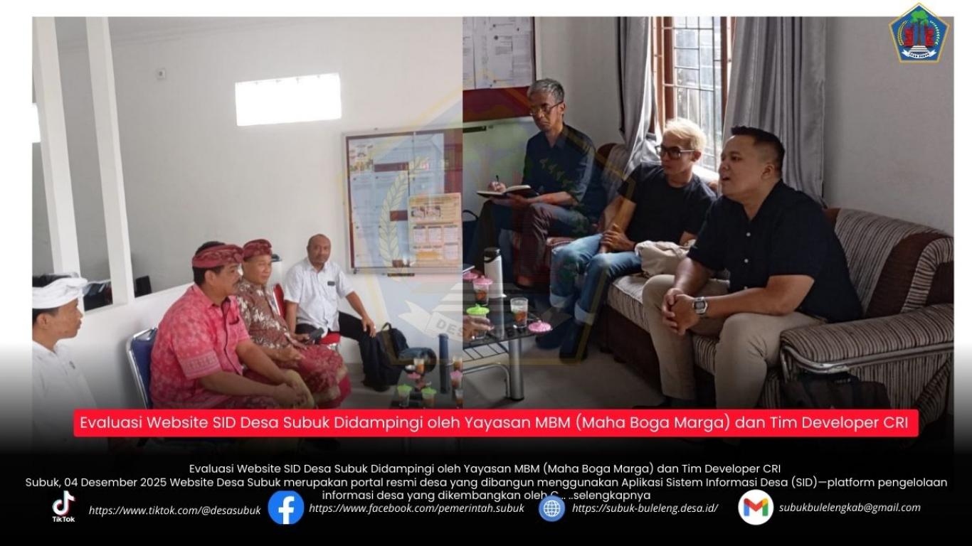 Pada tanggal 04 Desember 2025, Pemerintah Desa Subuk melaksanakan Evaluasi Website SID Desa Subuk yang didampingi oleh Yayasan MBM (Maha Boga Marga) bersama tim pengembang (developer) dari CRI. Pendampingan ini bertujuan untuk meningkatkan kualitas tata kelola informasi digital desa dan memastikan pengelolaan website berjalan optimal sesuai standar SID.