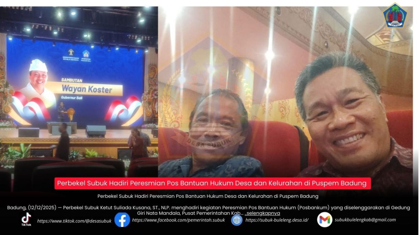 Badung, 12 Desember 2025 — Perbekel Subuk Ketut Suliada Kusana, ST., NLP. menghadiri kegiatan Peresmian Pos Bantuan Hukum (Posbankum) yang diselenggarakan di Gedung Giri Nata Mandala, Pusat Pemerintahan Kabupaten Badung. Program ini dilaksanakan dalam rangka memperkuat akses layanan bantuan hukum bagi masyarakat di tingkat desa dan kelurahan.