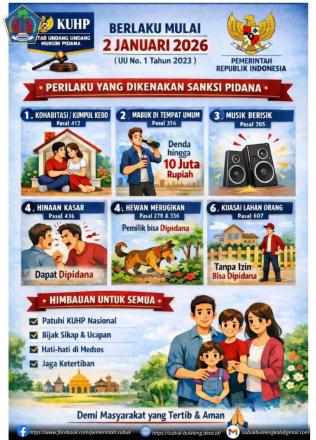 Dalam rangka meningkatkan ketertiban dan keamanan masyarakat, Pemerintah Republik Indonesia menetapkan Kitab Undang-Undang Hukum Pidana (KUHP) Nasional berdasarkan UU Nomor 1 Tahun 2023 yang mulai berlaku efektif pada tanggal 2 Januari 2026.
